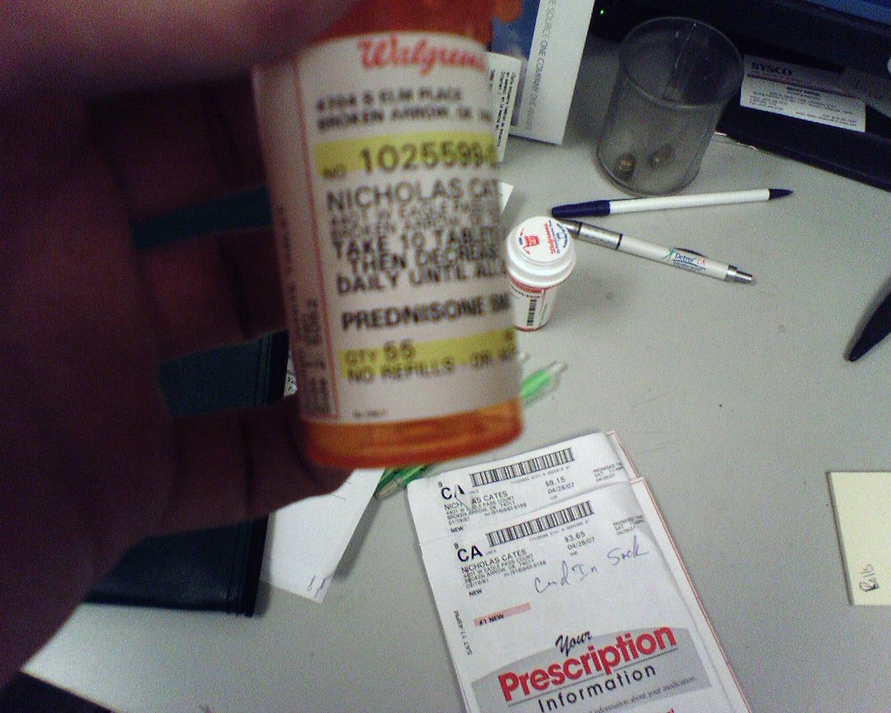 Taking some steroids to get rid of this pesky little poison ivey I got into. Its making me really hungry and I'm eating all the time. Also got some pills to help me sleep at night so I don't wake up scratching. To top it off also got two shots right in the ass. At least the nurse was good looking, made it all worth it. --Nick Cates Sent Via My SK3 |