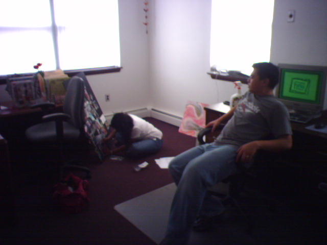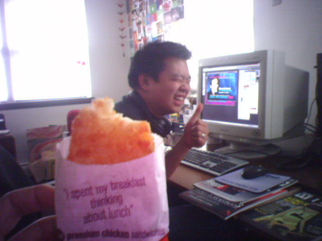 Rockstarr says I should post more poinient things...so here's something like that...I think. This is Reagan, on-air graphics designer slash co-worker. He's laughing hysterically because someone took a bite out of my Hash Brown. I even managed to include the hash brown wrapper with the quote on it in this picture. Damn I'm good. --PhD |