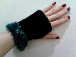 Check out these amazing custom-knitted gloves. I love the fringe color. The creatrix (the reviewer, not the poster or the Bionic Woman) didn't even chide me last night when I put them on backwards last night and gave myself accidental Muppet hands. |
