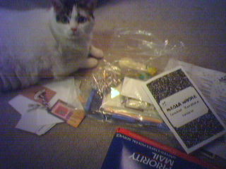 ![]() ![]() A big shout out to Mike for coming over and dragging my ass out of bed. He even made sure I ate lunch, knowing that when I get in a funk like this (Granny unreachable, Mom unhappy, job untenable, festival still over 1000 miles away) I tend not to eat. Mmm. Rome's Pizza. The Adult Swim shirt, BTW, started out as a men's x-large before I and my serger got a hold of it. And to make it even better, when I got back from refilling the antidepressant, there was Sampler in my mailbox. Sug loves The Sampler almost as much as I do. (You can see her ultrasound spot right behind her front shoulder. Don't tell her I told you that. She's very self-conscious.) --regan |