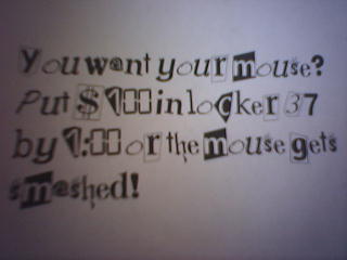 ![]() ![]() ![]() ![]() ![]() ![]() I got into the office and my mouse was gone. I email the staff about it and 10 minutes later there is a ransom note on my desk saying that I need to put $100 in a specific locker by 13:00 or my mouse gets smashed. As I didn't have $100 for a cheap old iMac mouse handy, I printed a $100 bill (Thanks to Bill's suggestion, no pun intended). I then cleaned my desk from some junk and threw it in the locker with the bill taped to the inside. Co-worker Joe returns my mouse and is surprised to hear I got a ransom note. He knows nothing about it. So co-worker Nick gets motivated to be my private investigator but as of 16:48 we have no idea who left the note. |