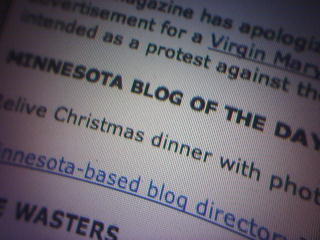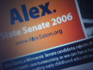 ![]() ![]() ![]() ![]() ![]() ![]() Back to the office today after a 4 day weekend and a good percentage of my co-workers are either on vacation or out ill. My cousin and aunt and other relatives are sick now too. We're not sure if it was something we ate or what. Either way, it is panning out to be a slow day at the office. This morning I find that City Pages listed me as Minnesota Blog of the Day today which I think is reflective of what Rex said today on his Today's Miscellaneous Local Links post on MNspeak.com: "The [Minnesota] blogosphere is pretty dead right now." My friend Bill, who was Blog of the Day two weeks ago had better insight via AIM: "There are 365 days and less than 300 blogs on their list." Either way, I appreciate the nod from City Pages. Now I am proofreading Alex Eaton's forthcoming lit piece on health care designed by Tod Foley. While Alex has been spending the majority of his campaign at a very grassroots level -- talking with neighbors and delegates one-on-one and becoming a true conduit between the people he will be representing and the Minnesota Senate -- I am really impressed seeing Alex's ideas and plans being put into a solid piece by Tod. While many people that have talked to Alex about Health Care already understand where he stands and what he wants to do, this will help people in Senate District 62 that haven't yet met him or been able to talk with him about the issues. I can't wait for this to get released to the public as well as put on the website. Tonight, I will be an in-studio guest of sorts on MTN Channel 17's Totally Scrabble Tuesday. If you have cable in Minneapolis, tune in at 11pm! I will post about it after the show. |