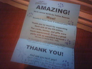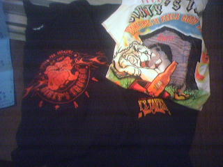 ![]() ![]() ![]() ![]() Opened first was a thank you letter from Herb the cat. Amy and I attended his birthday party last week and he raised $235 for Feline Rescue, which is a no-kill and fully volunteer cat shelter in Saint Paul. Way to go Herb! Then I got a package from hiptop Nation blogger Matt Gambrell who sent some bad-ass shirts from his studio, Tornado Alley Graphics. Quite awesome and I will be wearing them and posting them around. Maybe even tonight! Major w00t! Thanks! |