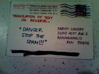 | Danger Stop the Spam: Postcard #2 Wed 11.15.06 3:52pm PST #19830 |