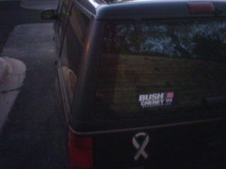 ![]() ![]() ![]() ![]() ![]() ![]() ![]() Roommate Allen borrowed his co-worker's old beater SUV when his car broke down. He has since gotten another vehicle, and this SUV sat in front of my house for quite some time. I offered to drive it to his work today. First and last time I drive a vehicle with a "Bush" sticker on it. This was also the first time I drove a car with a "Support Our Troops" sticker. I was able to leave rubber many times. Yay! |