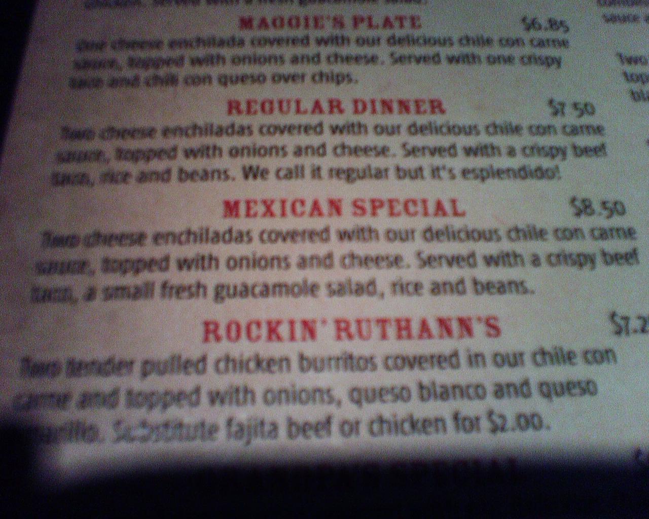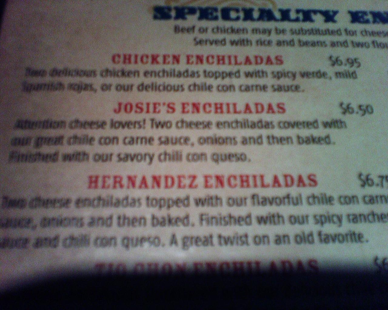 ![]() ![]() ![]() ![]() ![]() Once again, if you're ever in Austin... I recommend the Regular Dinner or Josie's enchiladas. Both very good choices. lonerisks.com apt404.com AIM - sorenlikesyou |