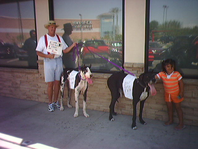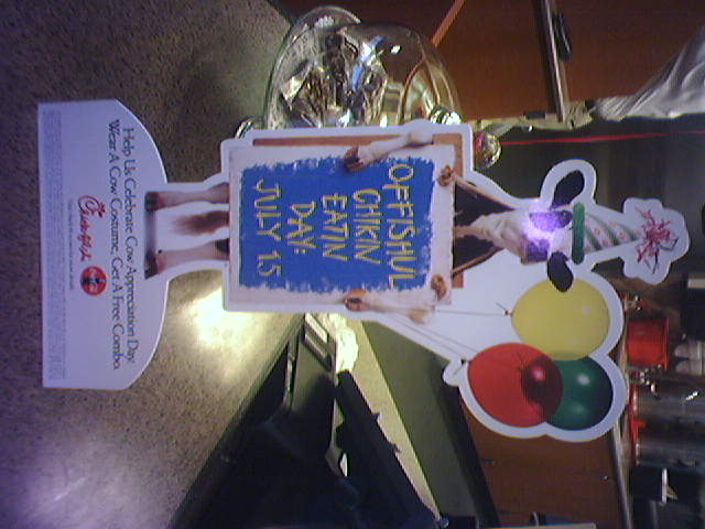![]() ![]() ![]() ![]() Chik-fik-a is running their "cow appreciation day". If you dress up as a cow, you get free food. This couple brought in their pair of great danes with udders, cow ears, and the "eat mor chickn" signs. Poor doggies!! The couple got a pair of coupons for the free food, and the manager was heard to say 'give the dogs whatever they want!' --subether |