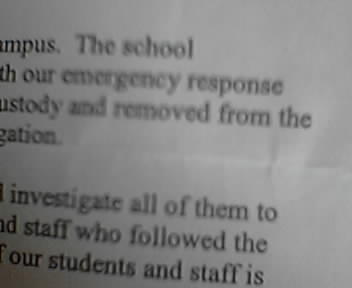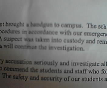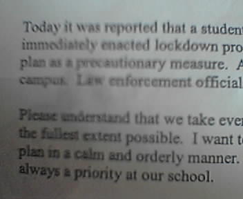 ![]() ![]() ![]() ![]() ![]() ![]() ![]() it reads: Dear Parents and Guardians: Today it was reported that a student brought a handgun to campus. The school immediately enacted lockdown procedures in accordance with our emergency response plan as a precautionary measure. A suspect was taken into custody and removed from the campus. Law enforcement officials will continue the investigation. Please understand that we take every accusation seriously and investigate all of them to the fullest extent possible. I want to commend the students and staff who followed the plan in a calm and orderly manner. The safety and security of our students and staff is always a priority at our school. Sincerely, Dr. Fred Hayes, Principal Clear Creek High School. - We were in lockdown for 3 hours....no one knew what was going on....after watching the news...found out that it was a BB gun that looks just like a handgun. :( Moral of the story....GUNS ARE BAD! :/ -sAmI- |