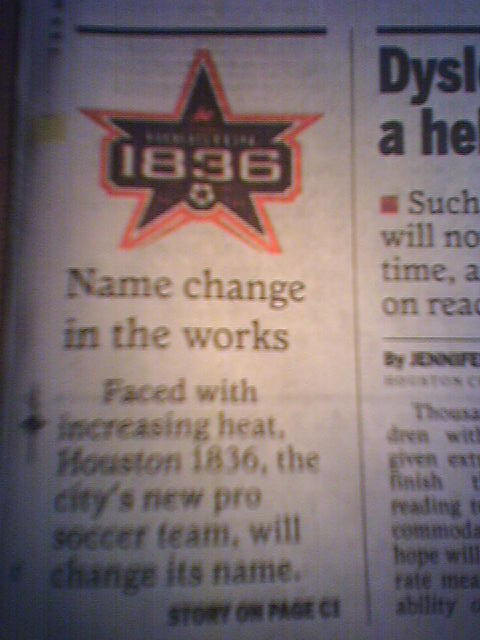 ![]() ![]() Well, they finally realized their name sucked, so after a whole month, they are going to change it. Here's the funny part. The target audience for these games is the hispanic community. Apparently they forgot what happened in 1836, besides the founding of Houston: 1. Texas won its independence from Mexico 2. The battle of the Alamo 3. The crushing defeat of Santa Anna at the hands of Sam Houston at the battle of San Jacinto Apparently, they're still sore at us about all that. Rumor has it that the new name will be the "Lonestar" or "lone star" which is a HELL of a lot better than 1836, mainly because it reminds me of beer. Heck I might even go see them now. Sleebus |