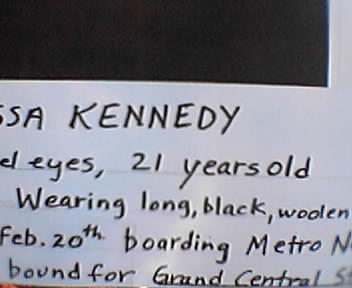 ![]() ![]() ![]() ![]() Saw this at the Poughkeepsie station and thought I'd post it here to help spread the word. It reads as follows: MISSING Melissa Kennedy, brown hair, hazel eyes, 21 years old, 5'7" 135 lbs. Wearing long black wollen coat. Last seen Friday Feb 20th boarding Metro North train 8:33pm at Poughkeepsie bound for Grand Central Station NYC. Call 1-800-451-4000. |