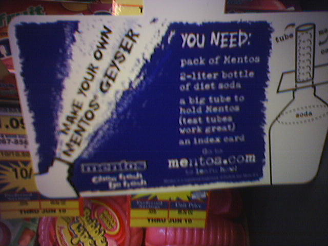 An advert by the mentos at the checkout. I was sure some 7 year old was gonna get his eye popped out by a bottle cap and the parents were going to try to sue, so it surprised me to see that they're endorsing it. Seems like a risky step for a company to take, I dunno. Then again, it's also like 6 months past the fad dying away, so it obviously took a long time for them to get hip to what the youngin's are doin' these days. ------------------------ Bird (Graci) -tinyurl.com/ytchdw "It's easy to regret your awkward conversations but hard to regret the ones you didn't have." |