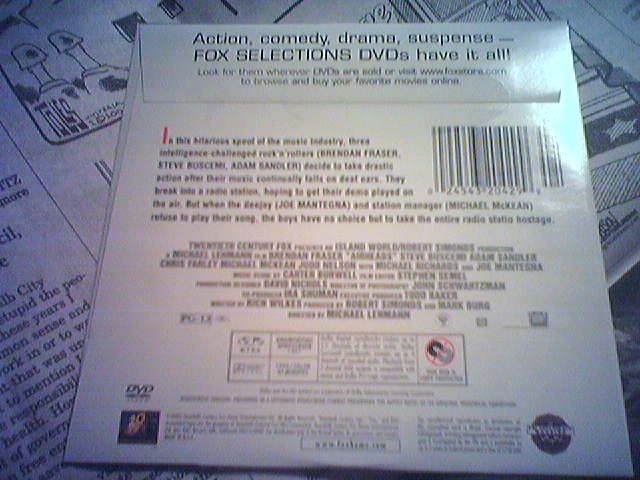 ![]() ![]() So Kellogg's has been doing a promotion where you send in 5 coupons from boxes of cereal and you get a free dvd movie, so far I got star wars episode I, and now airheads. However, unlike The Phantom Menace, Airheads showed up in a cheap paper sleave, not a plastic keep case, lame. I should get waterguns full of pepperspray and goto battle creek. --Chris Falco "Who's side did you take in the Halen/David Lee Roth split?" --Chris Falco CDF12345 on Skype |