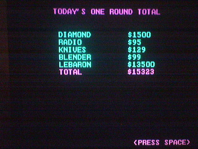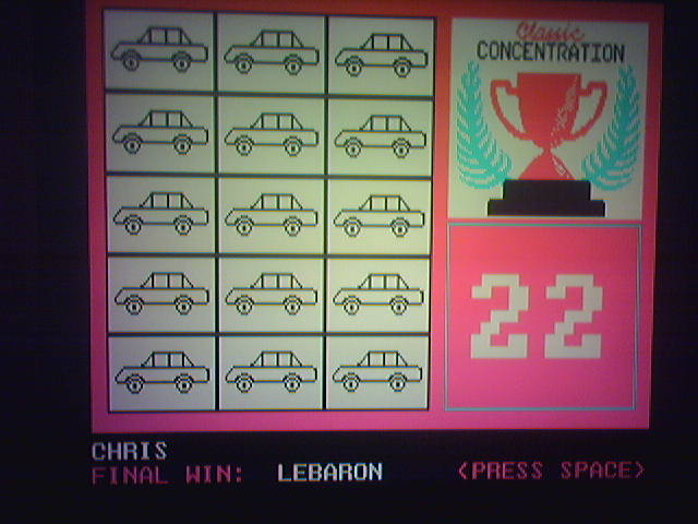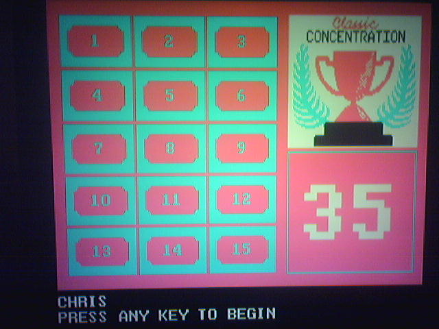 ![]() ![]() ![]() ![]() ![]() ![]() ![]() ![]() Somehow I ended up surfing for old tv shows, and got on a 70's and 80's game show kick. I was looking up all the shows I watched on rerun on usa network when I was a kid (like 7 or 8) Classics and obscure shows like: Press your luck Hot potato Tic tac dough Go Scrabble High rollers Remote Control $100,000 name that tune Lets make a deal Card sharks Man it was a trip down memory lane. Anyways, I had a bunch of game show games for my 8088 pc back in the day, including high rollers, and classic concentration, well in the course of my surfing. I found the original classic concentration game I used to have on 5 1/4 inch floppy disks. I got it running and destroyed the computer! Then I won a nice Lebaron in the bonus round, And the whole time I decided to take screen shots. Ahhh the memories! --Chris Falco |