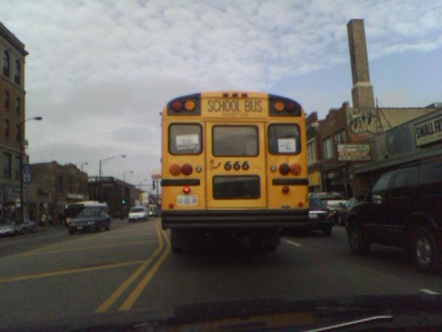 ![]() ![]() Saw this after dropping b1rd off at work. Either Tenacious D is in town or some kids are being bussed to hell :X The best thing, is in the window, there is a "how am I driving?" sign with a toll free number. Operator: "What bus are you calling about?" - "bus number 666" Operator: "And how is the driving?" - "Quite Devilish" --Chris Falco |