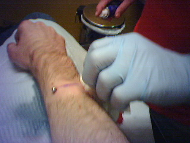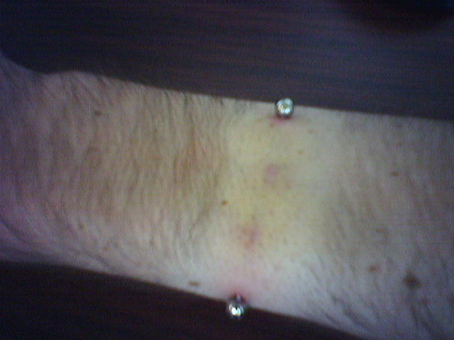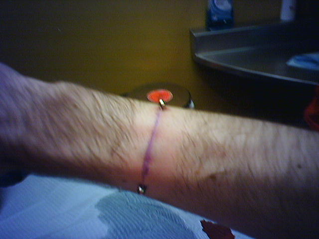 ![]() ![]() ![]() ![]() ![]() ![]() ![]() ![]() ![]() Hell City closed down and we decided since we were still in town we'd do some piercing. Carly got a unnamed ear piercing and Tony did a surface piercing on my forearm. Probably the most complex body mod since my dermal punches. It involved first shaving my arm, and then jumping two veins in my arm with the needle and then threading the tygon across my arm, but not before taking the bar and lifting up the skin a bit, and then finally screwing on the ball. The pain wasn't all that much, but the combination of that and only 3 hours of sleep and about 40 hours of working Hell City got me a little light headed. Luckily, thanks to Carly, a little fruit juice and I was all set. Now it's just a matter of healing and the hair growing back so I don't look like a freak! Note the fine Hell City merchandise I scored for working the weekend. :) |