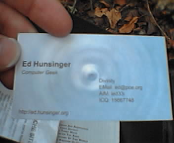 ![]() ![]() Saw this one on my gps and figured I'd hit it on the way out. As I got closer, I thought it looked familiar. Turns out I found this one a few months ago when I first started caching. Even found my card and the geode I left. That'll teach me to label my waypoints better. :P -div ed.hunsinger.org + divmobile |