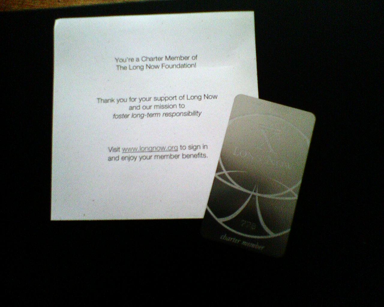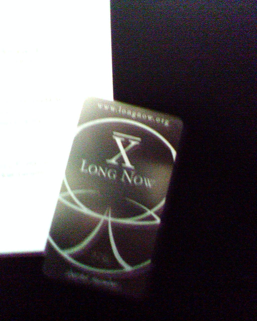 ![]() ![]() Got my official card for being founding member 778 of the Long Now Foundation. In 10,000 years you'll be able to see my name on the books. Yes, the card is made out of metal. |