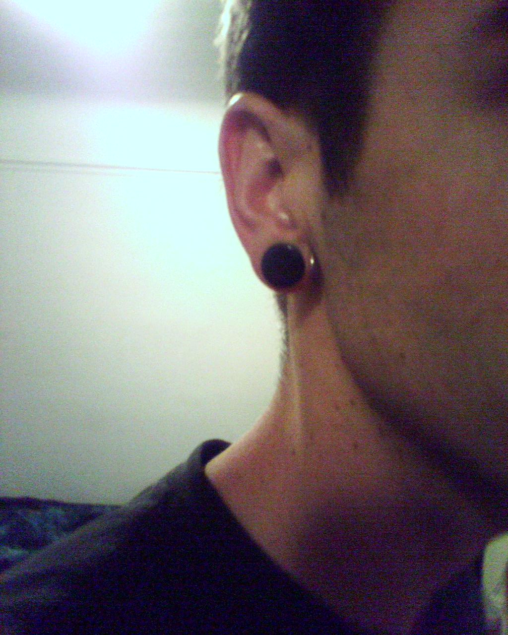 I'm officially at half an inch. I pulled out my 7/16" plugs and threw in the new obsidian 1/2" plugs I got at Braindrops on Haight. I also got full rings to replace the captive bead rings I used to have in my inner lobes. The plugs popped right in with no trouble. I hope these look alright with a tux for my cousin's wedding later this month. |