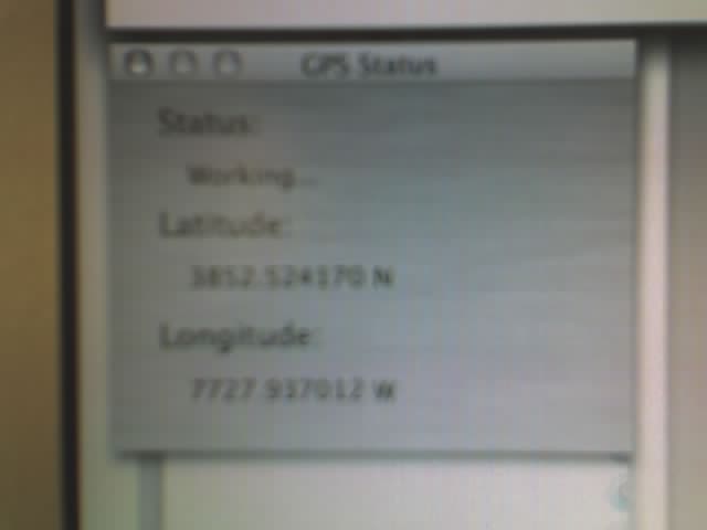 ![]() ![]() ![]() OMG, it works! :) I wanted to thank the good folks in the Apple Discussions under "Bluetooth", and the nameless reps at PharosGPS.com and gps4fun.com for their help today. I've successfully connected my Pharos Bluetooth GPS to the Powerbook and retrieved a streaming GPS lat/long in realtime. I'm now in the process of writing a python script to grab the lat/long, pass it as terraserver url params, thumbnail the resulting image, and update a webpage with the resulting date/time, lat/long, and a thumbnail of the area image. Currently, the Powerbook keeps a 24/7 internet connection to the Motorola V600, and run the python script on it to update a webpage. Once I get everything to a useable stable state, I'll release the webpage, source script, and a step-by-step process on how others can do this too. |