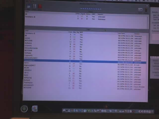 ![]() ![]() ![]() ![]() Now that I have a bluetooth GPS, I thought I might as well try it with MacStumbler and KisMAC. With MacStumbler, the bluetooth GPS was recognized instantly and it started retrieving the lat & long of discovered access points. With KisMAC, I need to configure and compile GPSd to allow realtime GPS use. Given the number of red dots in the above map, you can see most of my neighborhood is secure. One of our homeowner's association members is a network engineer, so in addition to running an access point with an amp and several directional antennas, he's given sermons on the use of WEP and MAC address locking. If you would like to see the discovered wireless LANS from Chantilly through Sterling, I found a number of insecure WLANs along Sterling Blvd, but found my neighborhood mostly secure. |