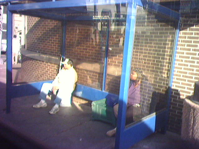In some of the urban bus shelters in Kansas City, the benches have been removed to prevent people from loitering, sleeping, or otherwise not waiting for the bus. Riders at this shelter have almost permanently usurped a nearby free paper box to serve as a bench. Today a man added an empty bucket to the usual seating arrangements. -heidi |