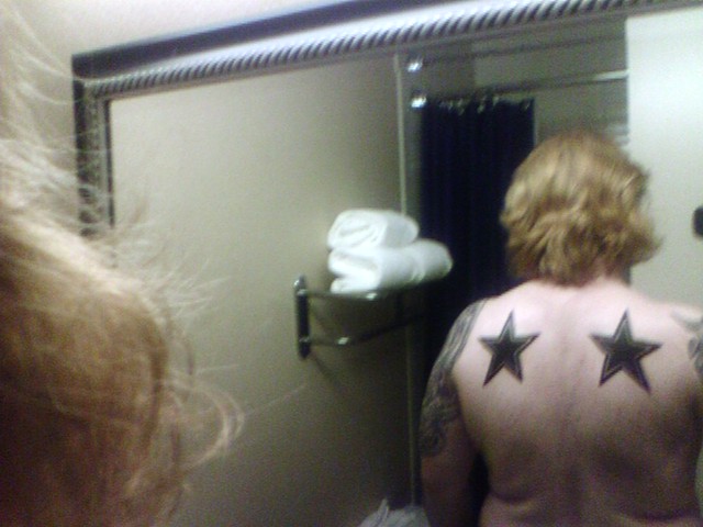 ![]() ![]() ![]() I had kicked around the idea of a new tattoo while in Houston. I had wanted some stars done for a bit, so I printed out my designs and hit the streets earlier this week. No luck, didn't like the peope places and or prices. Today I had ctually left after my pool party to find Ice Age, the night club owned by Mike Jones. It was a fruitless trip. Luckily though, the glowing neon of Space City Tattoo caught my eye. The front desk chap was friendly and quoted me a price that warrented me asking if that was for both. It was. Horrah! Overall a great and memorable experience. The highlights being: 1. Took almost 4 hours. 2. The place was all hispanic gang members 3. at one point a crack head came in and they paid him a meager wage to wash all the windows. 4. My tattoo artists first conversation piece was "I just got out of jail yesterday". 5. The other artist was tattoed head to toe, literally, with such things as the Cadillac logo on his check, and an H under his eye for Houston. 6. We listened to hardcore Houston based rap very loud the entire time. Even I blushed at some of the content. In the end, I got what I wanted, had a memorable experience, and paid dirt cheap. All in all a great way to wrap this trip up. |