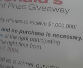 ![]() ![]() ![]() ![]() Don't forget that this weekend, McDonald's is giving away $1,000,000 to 15 random customers. It's part of the settlement related to the Monopoly and Who Wants to be a Millionaire contests. So spend your $1 on a double cheeseburger and pray that you don't get a heart attack (and that you win a cool million). --kalephunk |