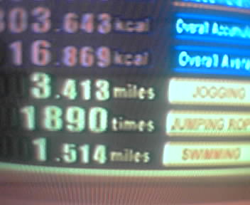 ![]() ![]() ![]() I recently decided I was fat, as I shopped for clothes today and had to get the next size up in pants. So I've started a workout regimen -- DDR 4 LYFE!! I dance for 35 minutes (25 min actual dancing) and according to the in-game computer, I burned 303 calories (about 17 calories per song), which is the equivalent of 3.4 miles jogging, 1890 jumping jacks, or 1.5 miles swimming. Donno how accurate it is, but I'm tired and sweaty. And my smoker's lungs didn't make it easy... *huff*puff* --kalephunk |