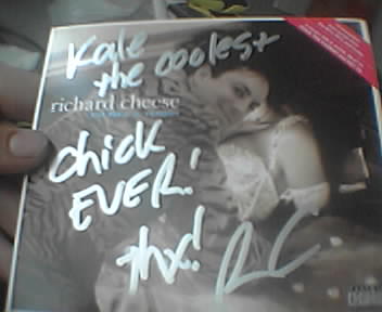 ![]() ![]() ![]() ![]() ![]() ![]() I got the new Richard Cheese and Lounge Against the Machine album today, "I'd Like a Virgin". I bought it two months ago and was promised that with it, I'd receive the CD, signed, a sticker, a keychain bottleopener, and a stick of gum. I was not disappointed -- it arrived addressed to "Kale the Coolest Chick Ever" and signed likewise, with TWO stickers, a keychain bottleopener, some literature, and of course, a stick of gum (Wrigley's). The album, by the way, rocks all of my socks. --kalephunk |