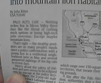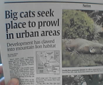 ![]() ![]() I pick up USA Today expecting to read "We're Eating More Beets" but instead see a half page "Dateline: Palo Alto" on the front of the second section, with a picture of the cougar that was killed in a back yard about a mile from my house, next to an elementary school. It wasn't reported in the news, but a week before, something spooked the horses on Coyote Hill Road, next door to where my wife and I work, and thhey all jumped the fence and were wandering in the parking lot. |