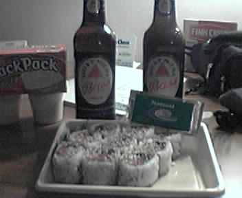 ![]() ![]() Wegman's wouldn't sell me a Bass Ale, only a six pack, but it took the night manager to figure out the error code. So I bought a six pacl, but then she had this big three-inch sticker that said "We ID 100%!" on her vest so she made a big production out of looking at my driver's license. Ooh -- out of state -- California. They had to go get a book and look up California. I guess they think maybe we nimber the years differently. Then the hotel didn't have a bottle opener, in the room or at the desk. Finally they found one. Now, sushi and beer, with a Hunt's tapioca pudding (chosen because it requires no refrigeration, another service the Fairfield Inn lacks). Tomorrow, de plane, de plane! |
