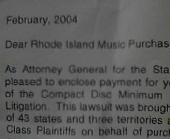 ![]() ![]() Today I got the settlement for the "Compact Disc Minimum Advertised Price Antitrust Litigation". All of $13.86. Here is a quote from www.musiccdsettlement.com/ Defendants have agreed to pay a combination of cash and non-cash consideration. Defendants' combined cash payments total $67,375,000. In addition, Distributor Defendants will provide $75,700,000 worth of prerecorded music compact discs. Some of the libraries got in on this and ended up with lots of new CD's and such. --Lyzard on the run hiplog |