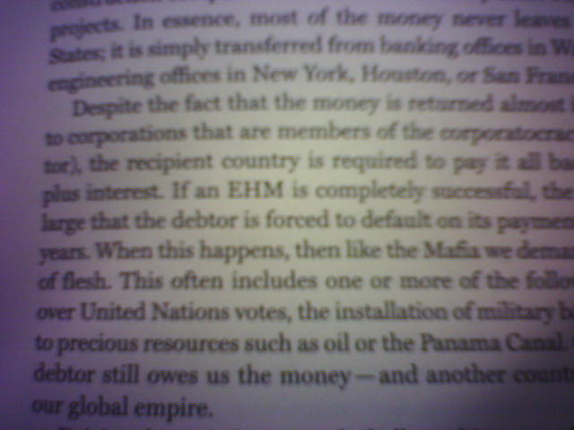 ![]() ![]() Next book up: "Confessions of An Economic Hit Man" by John Perkins. It deals with a small, real-life cadre of individuals whose only goal is to subvert other countries and third-world nations to the will of a global empire (Ours). They do this by making these countries take out loans, via the IMF and World Bank, to fund modernization projects in their country. By making these nations default on their loans, they become dependent on the US and must offer either natural resources (Ecuador: Oil/ Africa: Oil, Gold, Precious stones/ etc.) and/or politcal sway in the United Nations. Guess who finally decided to fight back against us when we tried the same techniques on them and they realized they were being sucked dry? That's right, Iraq. They pose a threat to US interests only because we sold them the weapons, sold them the pipeline, sold them a couple of power plants and then got indignant when they wouldn't tow the line. No wonder we are loathed by most countries. Like Chris Rock said "America is like that Uncle that paid your way through college, but molested you." On the other hand, Mel Brooks said it best in History Of The World..."It's good to be the King." Get this book NOW, you won't regret it. *** In a truly mad world, only the mad are sane... - Akira Kurosawa*** |