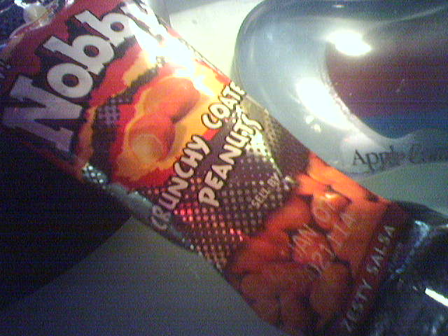 ![]() ![]() ![]() ![]() ![]() ![]() ![]() ![]() ![]() ![]() ![]() ![]() Yup. You guessed it. It's ¢.35 wings at Buffalo Wild Wings. Patrick and I are grabbing a bite and a few brews before our meeting tonight. Also pictured are the waitress crew in the bar area who apparently discovered some unused St. Patty's Day swag and transformed themselves into some sort of messed up hot pack of chick Umpa-Lumpa chicks. Earlier today I was walking through the "Gas Station" and discovered today's impulse purchase- Frito Lay's: Nobby's Crunchy Coated Peanuts - Salsa Flavored. At first I didn't know what to think. They were well.... crunchy, but with a funky taste. A few more later- eh.... It was worth the buck. -Matt |