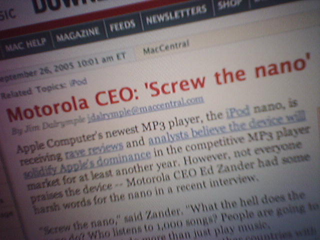| Motorola CEO Goes Off On Apple's Nano Mon 09.26.05 5:45pm PDT #15480 |
