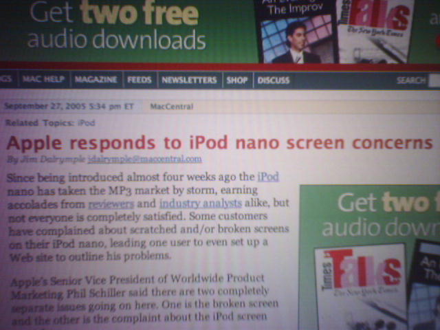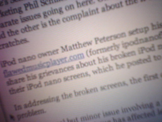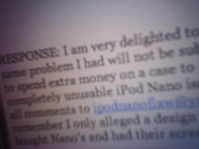 ![]() ![]() ![]() ![]() ![]() Poor poor Matthew Peterson scratched his nano and setup a website to expose the "flaw". I don't know where to begin, but I will start with "You Moron". What exactly did this idiot think? The nano was scrtach resistant?? Has this dingis ever owned an iPod or did Mommy and Daddy buy him his first and on the day of show and tell he scratched it while toting about in his bookbag? God forbid he ever lose it, but then again, he still has his website up. This could be another "flaw". Mleh Mleh Mleh "...still have to spend extra money on a case to prevent scratching." WTF?? I don't see anywhere where it illustrates scratch resistance. If anything, it screams as MLee points out "I will scratch the first chance I get". Wait until he sits on it and it breaks, oh wait *gush* my bad, that can be a flaw on Apple's part too. I can go on and on, but I will step down from my soap box and listen to my scratched up iPod and create my own website called flawedmusicplayerowner.com . Hey dill weed... iPods scratch. Just FYI.....DORK. -Matt |