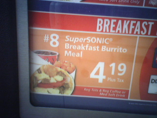 ![]() ![]() Seems Ragan's got some allergy issues today and has decided to take a "sick" day. I guess I can find SOMETHING else to do today to keep me amused. Breakfast is the SUPER SONIC burrito. If you have the means, I highly recommend picking one up. |