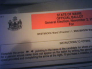 ![]() ![]() ![]() ![]() Well, filling in the arrow with the marker actually, but I do miss the ka-chunk of those old lever voting machines I used back in NY. No troubles here in Maine, just a pleasant walk over the river to my polling place and no real wait (not surprising - 5 polling places for about 13,000 registered voters. The last town I lived in had about two-thirds as many voters, but just one polling place). It was about lunchtime when we left though and the crowds were starting to converge. Now, the waiting. Hopefully it will be measured in days, not weeks. One of the state issues for Maine is, to paraphrase, "Should it be made illegal for hunters to put huge piles of jelly doughnuts in the woods, then shoot the bears that come to eat the doughnuts." Because it seems that is how a lot of bear "hunting" goes on here. I'm no bear hunting expert, but that seems just a bit unsportsman-like to me. What's on the ballot in your state or town? |
