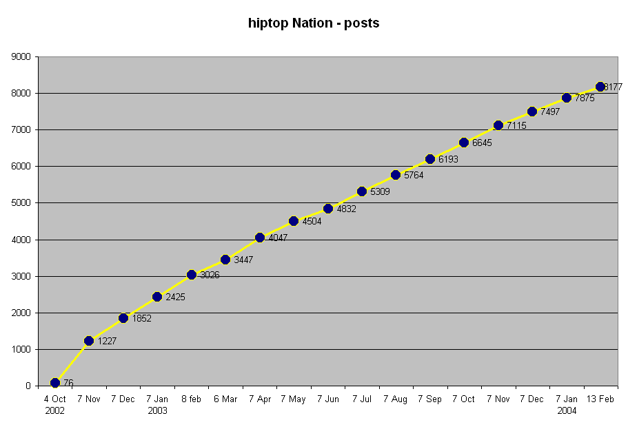 New stats up to date as of 13 Feb, 2004. I am not very good at Excel, but feel free to download the workbook and analyze it to your liking (please share any analysis). Check out this worksheet from Michael Smith for more advanced statistical wrangling. (based on 26 May stats)