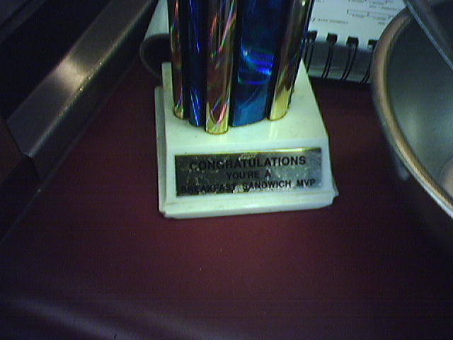 ![]() ![]() ![]() This one's strange. Getting coffee at a local Dunkin Donuts, I saw a small trophy tucked away in the corner. The plaque reads "congratulations, you're a Breakfast Sandwich MVP." So....did a Dunkin Donuts employee win it for making the best breakfast sandwiches? Or did someone win it for eating the most breakfast sandwiches? I think a breakfast sandwich won the trophy....I suspect the plucky "sausage-egg-and-cheeze-on-croissant" walked away with this prize. But was later forced to give up the trophy because of a scandal that involved non-consensual relations with an underage jelly donut. And somewhere there is a Hall of Fame for breakfast sandwiches. And a Spring Training camp, where they practice their mad breakfast sandwich skillz. Yeah. |