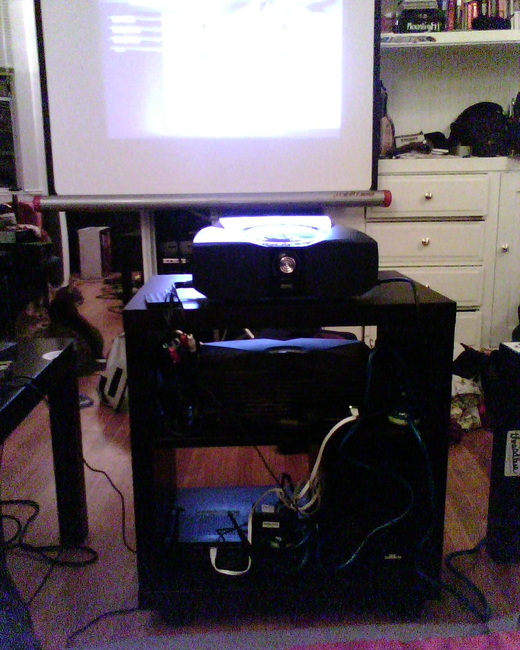 ![]() ![]() A trip to Ikea and a few hours of work and I now have a rolling media center that all works off of a single power plug. No more playing AV boy whenever we want to watch a movie. I even got one of my old wrt54g routers (running dd-wrt) to act as a wireless bridge for the Xbox so that Xbox Media Center can access my media on shared network drives. The only thing left is to get a good pair of speakers to supplement the subwoofer. Pics are probaly too dark to show, but I've got a projector up top, xbox with wireless contoller in the middle, and wrt54g router and subwoofer on the bottom shelf. Two triple plugs daisy chained and an extra long power cord. |