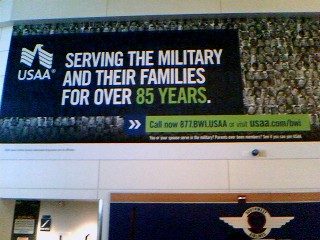 This greeted me as I walked off the plane in Baltimore. I still find seeing USAA ads creepy, considering most of the time I worked there the policy was that we didn't need to advertise. Not only are they advertising, they're tracking the success of the ads, as you can see from the custom 800 number and URL on the ad. |