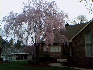 Looks like cherry blossom season is going to be woefully short here this year. This massive weeping cherry is in a neighbor's yard. After walking by the ones planted in our condo common area, I had to run back with my camera to catch them before they disappear. |