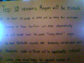![]() ![]() ![]() ![]() ![]() ![]() Laura (left in first photo), Tricia (right in first photo), and Heather (Houston on a family emergency in first photo) hostessed a going away party for me at Flying Saucer Friday night. It was a lot of fun. Got to see all sorts of folks from throughout my time down here, including (l to r, second photo) Sandra, Rick, Ashley, Carolyn; Laura with Tricia and Wade over her shoulder (third photo) tactfully avoiding product placement; and Tim and Amy (fourth photo). Follow it up with a masterful shot of Steve with me, Tim, and Amy in the foreground (courtesy of Tim's long arms). Not pictured are Scott, Dean and new wife of three months whose name I've managed to forget, Joel, Jenny, Pam and Susan. There were even balloons, and Laura put together a "Top Ten Reasons Regan Will Be Missed" ala David Letterman. My favorites are "Losing USAA record holder for greatest number of simultaneous I'M sessions" and "Who will remind us of... everyone's second cousin's boyfriend's birthday?" Love you guys. |
