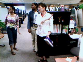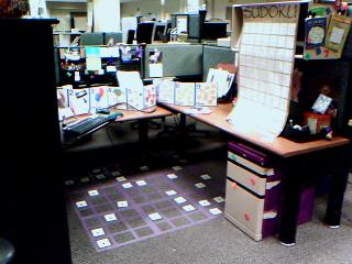 ![]() ![]() ![]() ![]() ![]() ![]() ![]() ![]() We did a sudoku theme for Amy's birthday celebration at work. I used a tutorial on Craftster to make a felt flower for the flamingo cabochon I'd picked up. The desk was all puzzled up, and Ashley and I did a 4 foot wide real puzzle on the floor tiles. This morning I got up and created a pair of shoe-do-ku (I know the second shoe shot is experiencing some whiteout, but it shows the colors better). Janet got her a cake from downstairs that fits with Amy's upcoming vacation (Pam modified an old New Yorker cover to fit). Al in all, highly successful. |
