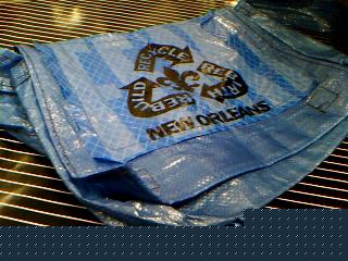 Picked up this great messenger bag made out of a FEMA tarp by an independent crafter in New Orleans. Mine has velcro instead of a grommet, but I imagine this way keeps it from ripping if I overstuff it. Which never happens. *blinks innocently* |