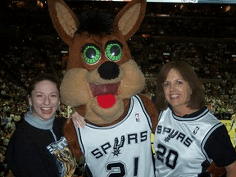![]() ![]() ![]() ![]() My team had a "Spurs kitty" going around for contributions to game ticket for my birthday. Laura got us these great seats with they money, and although they lost, we still had a lot of fun. She wrote Jon to arrange the Coyote visit, and you can tell from the horrific "do I have broccoli in my molars" smile that I was pleasantly surprised. ;) |