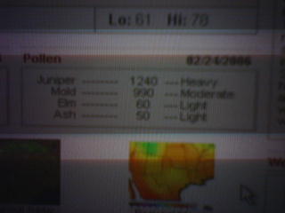 I'm officially a Texan. I've developed mountain juniper pollinosis. Interestingly, the allergen is a carbohydrate, which will be good news for San Antonians on the Atkins diet. |
