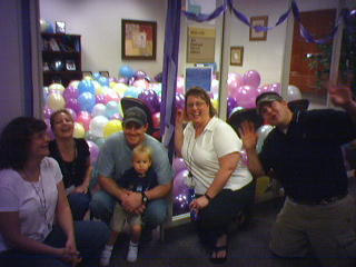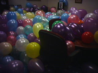 ![]() ![]() ![]() ![]() We (once again - Laura and I tried this a few years back) attempted to fill an office with balloons. We came much closer this time, mostly because of the generous donation of air compressors. This is what c. 800 balloons looks like in an office. The guilty parties are (from left to right) Jenny, Kay, Lee (with Cameron who wanted no part of the shenanigans), Andrea, and Jason, who is miming "drowning in balloons." --regan |