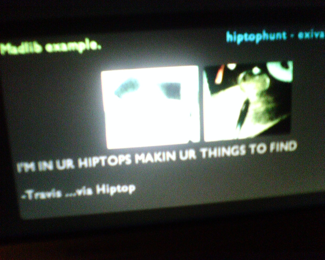 ![]() ![]() ![]() ![]() ![]() Thanks to ThinkGeek for copying HiptopHunt's "IM IN UR ____ ____ UR ___" item. ...I'd like a free tshirt as compensation and as an early birthday gift Regan. :P -Travis ...via Hiptop ...This is of course all me being a smartass. kthx. |